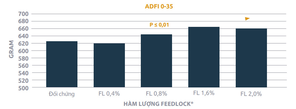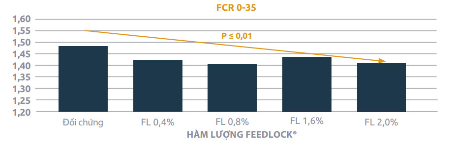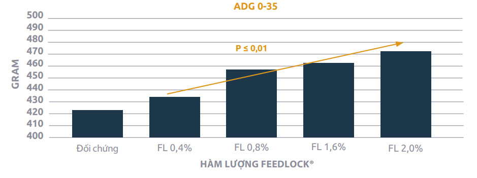 FeedLock® là giải pháp tăng cường an toàn sinh học trong trại chăn nuôi. Trong nhiều thập niên vừa qua, hỗn hợp MCFA đã khẳng định hiệu quả trên năng suất nái, heo con và heo thịt. Agrimprove là chuyên gia đầu ngành, sở hữu các sáng chế độc quyền chuyên sản xuất và phát triển phức hợp MCFA chuyên dụng đáp ứng các yêu cầu đặc biệt. Chế phẩm FeedLock® được phát triển cho các mục đích này. Kết quả nghiên cứu gần đây tại Đại học Bang Kansas cho thấy có sự gia tăng ADG, ADFI, FCR khi nâng cao hàm lượng FeedLock® (lên đến 1,5%) trong khẩu phần (Gebhardt và cộng sự 2020) (xem bảng bên dưới).