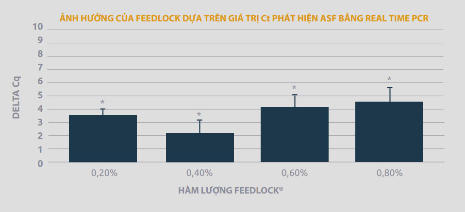 Các Viện nghiên cứu độc lập ở Hoa Kỳ và Việt Nam đã khẳng định hiệu lực của chế phẩm trong thử nghiệm in vitro cũng như trên bản động vật. FeedLock® đạt khả năng vô hiệu hóa vi rút đã gây nhiễm trong thức ăn và nhờ phương thức này, FeedLock® bảo vệ vật nuôi không nhiễm bệnh từ đường truyền lây qua thức ăn. Theo quan điểm này, Viện Nghiên cứu Thú y Quốc gia Việt Nam đã thực hiện nghiên cứu kiểm tra hiệu quả của FeedLock® đối với ASF. Bổ sung phức hợp MCFA vào thức ăn chăn nuôi hoàn chỉnh có chứa virus ASF. Sau 24 giờ gây nhiễm, tiến hành chiết tách DNA và kiểm tra real-time PCR. Tất cả các nồng độ được kiểm tra có sự gia tăng giá trị chu kỳ ngưỡng khi so sánh với đối chứng dương về mặt thống kê (p<0,05). Kết quả được biểu diễn qua biểu đồ delta Cq.